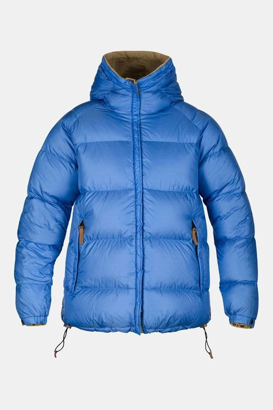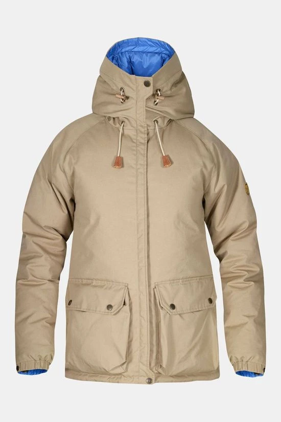 - De Fjällräven No. 1 voor dames is een binnenste buiten te keren donsjack (een G-1000-zijde en een blauwe zijde) van G-1000 Eco van gerecycled polyester en biologisch katoen.