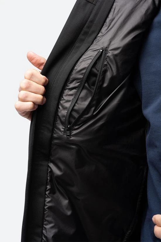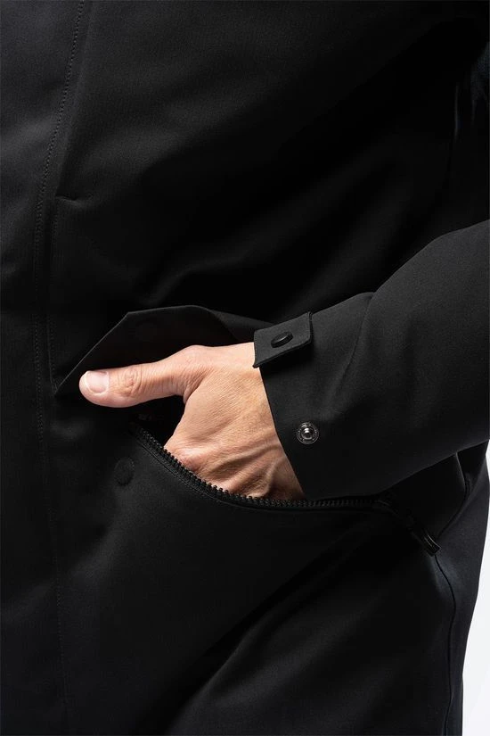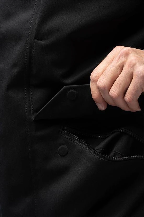- De buitenjas heeft twee warme handzakken met rits en een borstzak.