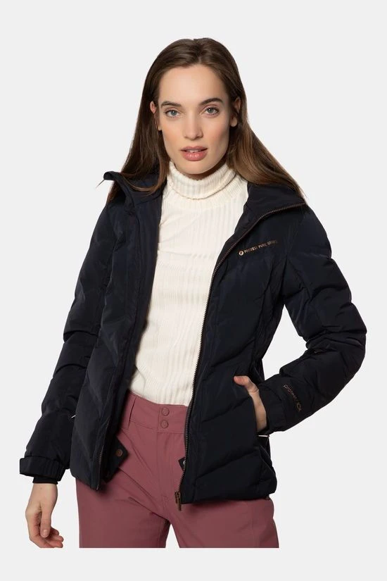 - Deze jas is gemaakt van een licht glanzende stof voor een chique look op de piste.